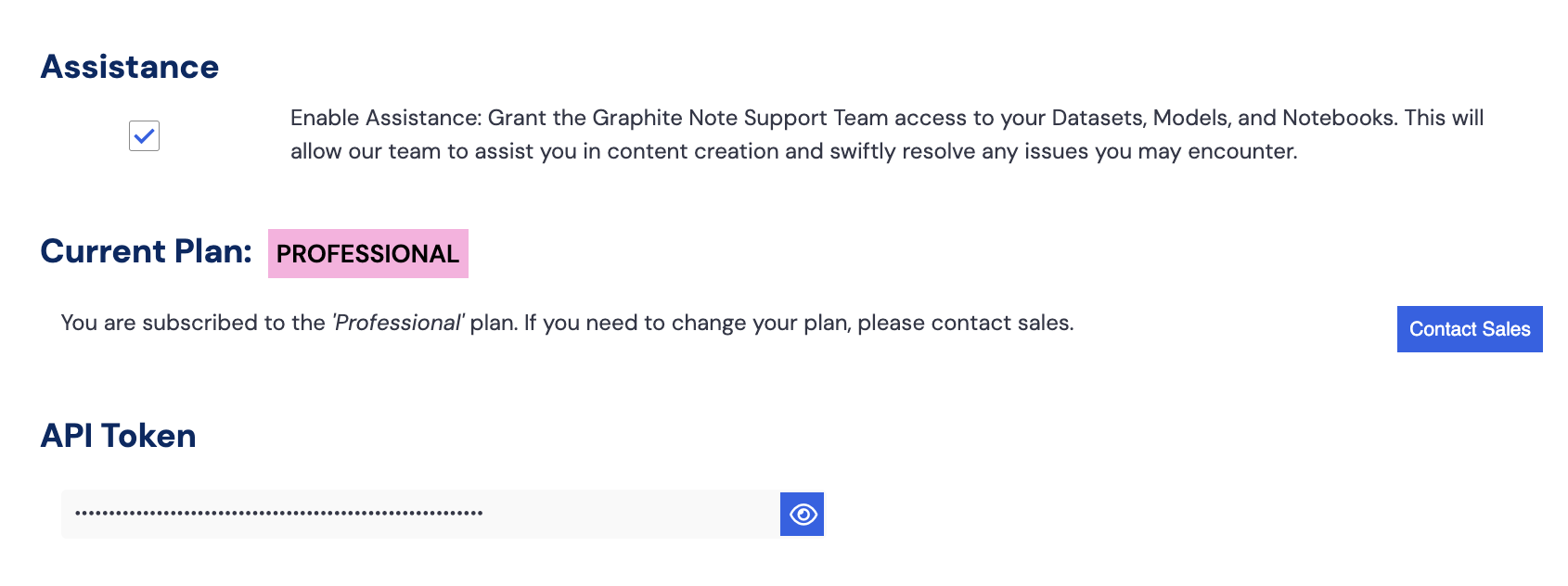 A toggle option to enable assistance from the Graphite Note Support Team. By enabling this feature, users grant the support team access to their datasets, models, and notebooks. This facilitates quicker issue resolution and support for content creation. Assistance option is enabled by default.
