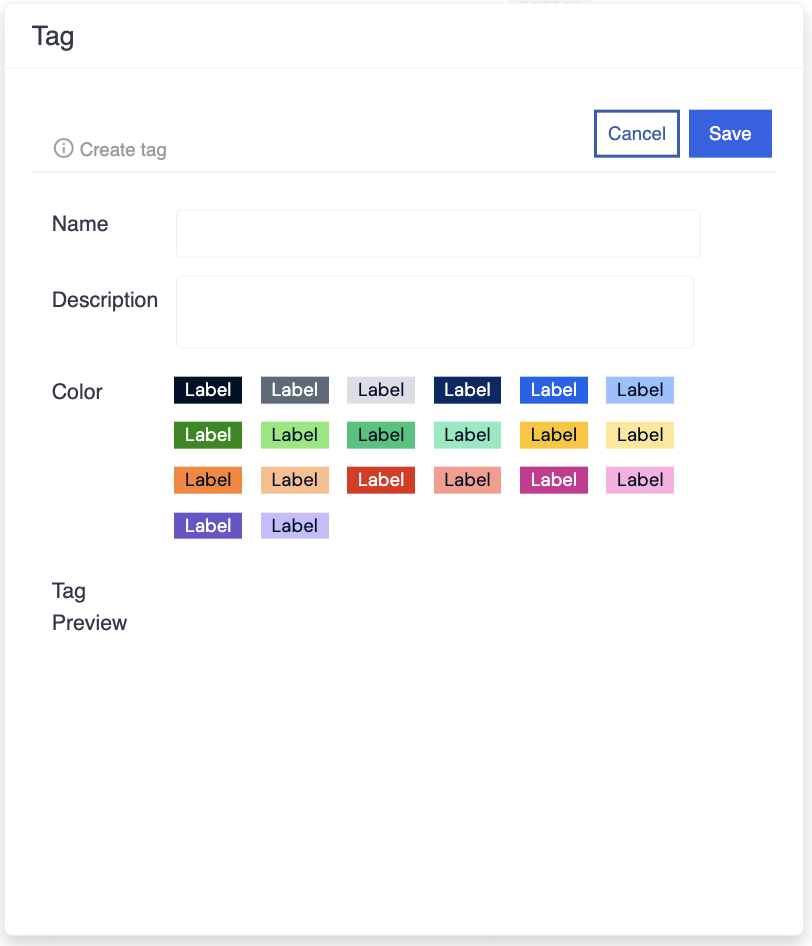 To create a new tag, users can define its name and description while selecting a color for visual distinction. This allows tags to be uniquely identifiable and easy to manage. Tags can also be edited or deleted using the action icons, providing flexibility for keeping the tagging system up-to-date.