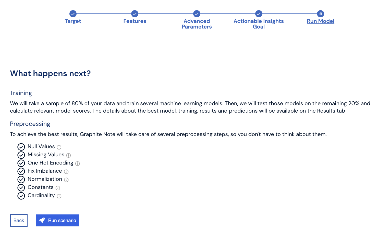Moving forward, you'll see a comprehensive list of preprocessing steps that Graphite Note will apply to prepare your data for training. This enhances data quality, ensuring your model produces accurate results. Typically, these steps are performed by data scientists, but with our no-code machine learning platform, Graphite Note handles it for you. After reviewing the preprocessing steps, you can finish and **Run Scenario** that will start model training.