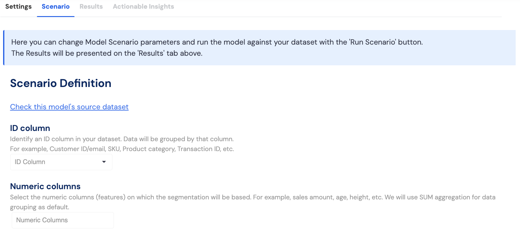 To run this model in Graphite, first identify an ID column to distinguish between values (e.g., customers or products within groups). Next, select the numeric columns (features) from your dataset for segmentation.