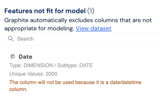 Features Not Fit for Model: Graphite automatically excludes columns that aren’t suitable for modeling, such as date/datetime columns, to ensure only relevant features are used in training.