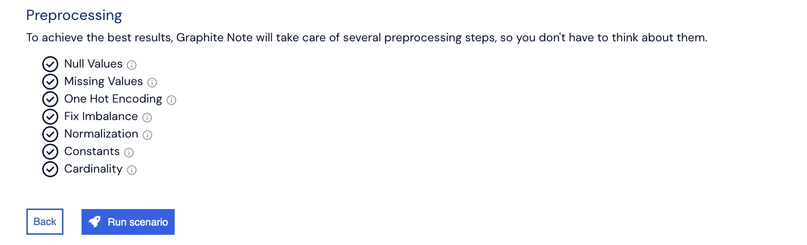 In Graphite Note, data preparation is divided into two main steps to ensure optimal results, with all tasks handled automatically so you don’t have to worry about them. Data preprocessing is a crucial step in machine learning, enhancing model accuracy and performance by transforming and cleaning the raw data to remove inconsistencies, handle missing values, and scale features, and ensure compatibility with the chosen algorithm.
