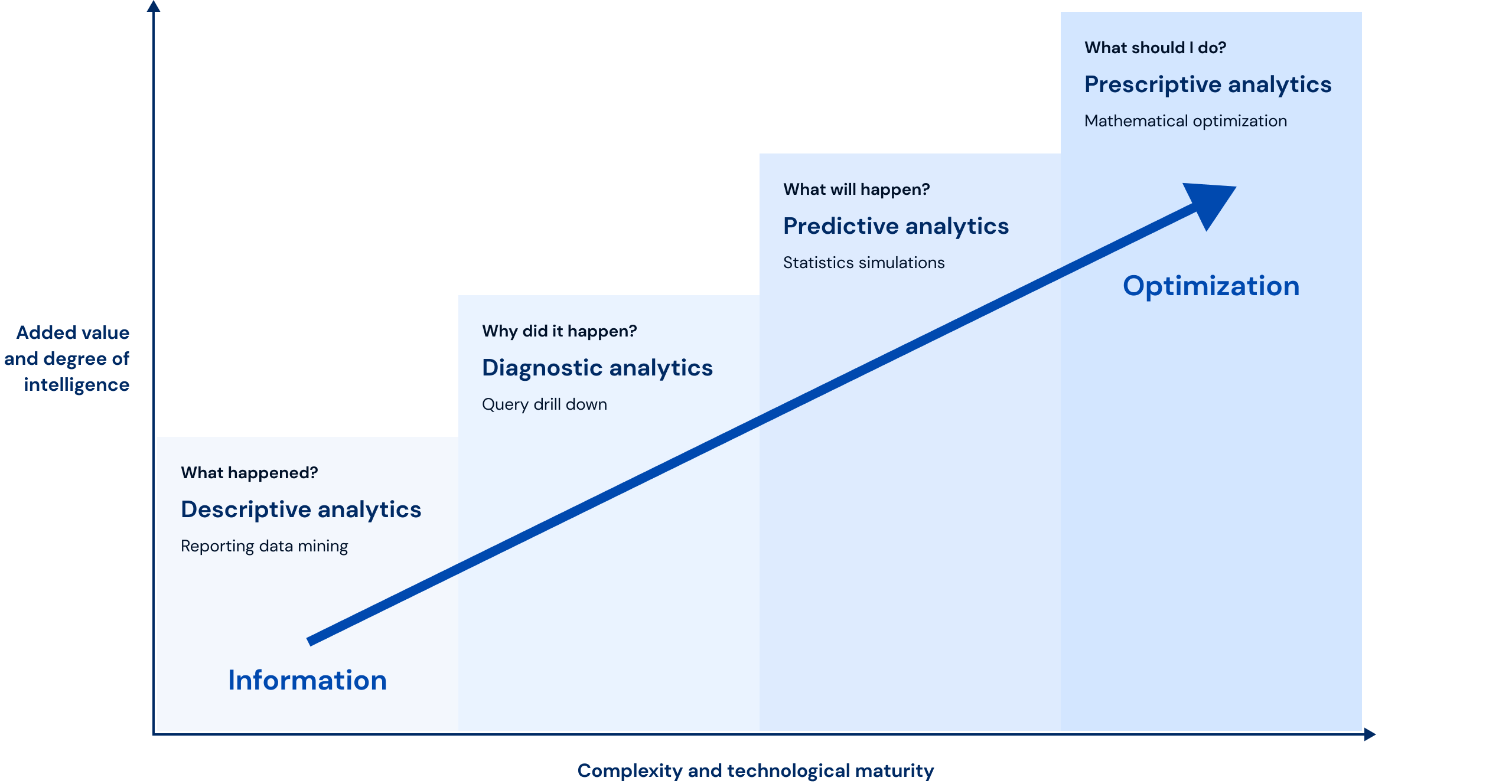 Analytics maturity represents an organization’s progression in leveraging data to drive insights and decisions. This journey typically follows four levels: