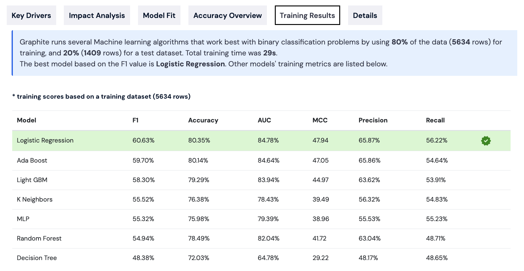 In the **Training Results Tab**, you will find information about all the models automatically considered during the training process. Graphite ran several machine learning algorithms suitable for binary classification problems, using 80% of the data for training and 20% for testing. The best model, based on the F1 score, is chosen and marked in green in the models list.