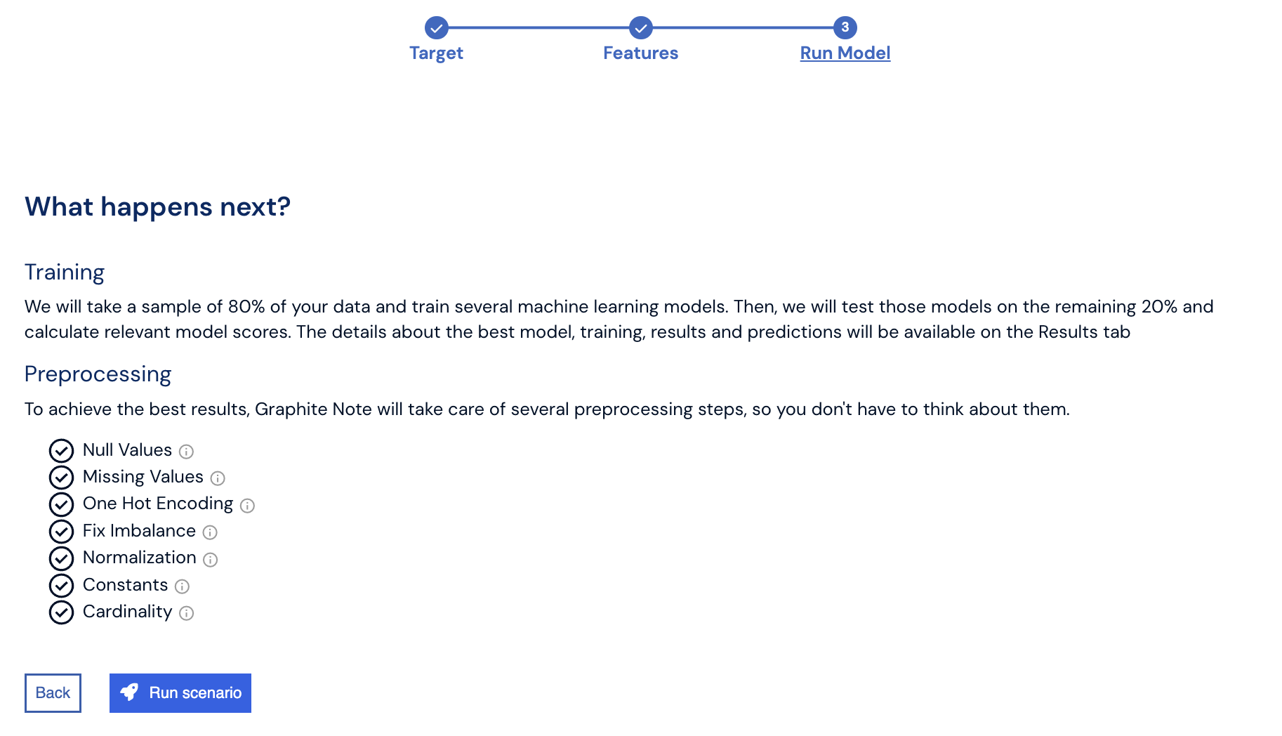 Moving forward, you'll see a comprehensive list of preprocessing steps that Graphite Note will apply to prepare your data for training. This enhances data quality, ensuring your model produces accurate results. Typically, these steps are performed by data scientists, but with our no-code machine learning platform, Graphite Note handles it for you. After reviewing the preprocessing steps, you can finish and **Run Scenario**.