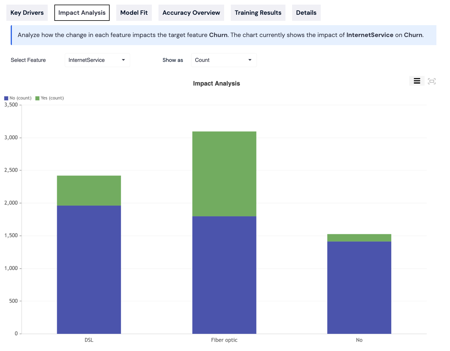 The Impact Analysis tab allows you to select various features and analyze, using a bar chart, how changes in each feature affect the target feature. You can switch between Count and Percentage views.