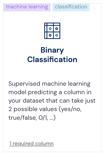 <figure><img src="https://3727300098-files.gitbook.io/~/files/v0/b/gitbook-x-prod.appspot.com/o/spaces%2FgnR78y9L7FDWeb4jdvdW%2Fuploads%2FKk1ccUG4cqA7MjctIc7a%2FScreenshot%202024-07-09%20at%2017.57.04.png?alt=media&#x26;token=3fd18875-8525-4432-8d09-a9a368428188" alt="" width="218"><figcaption><p>Binary Classification</p></figcaption></figure>