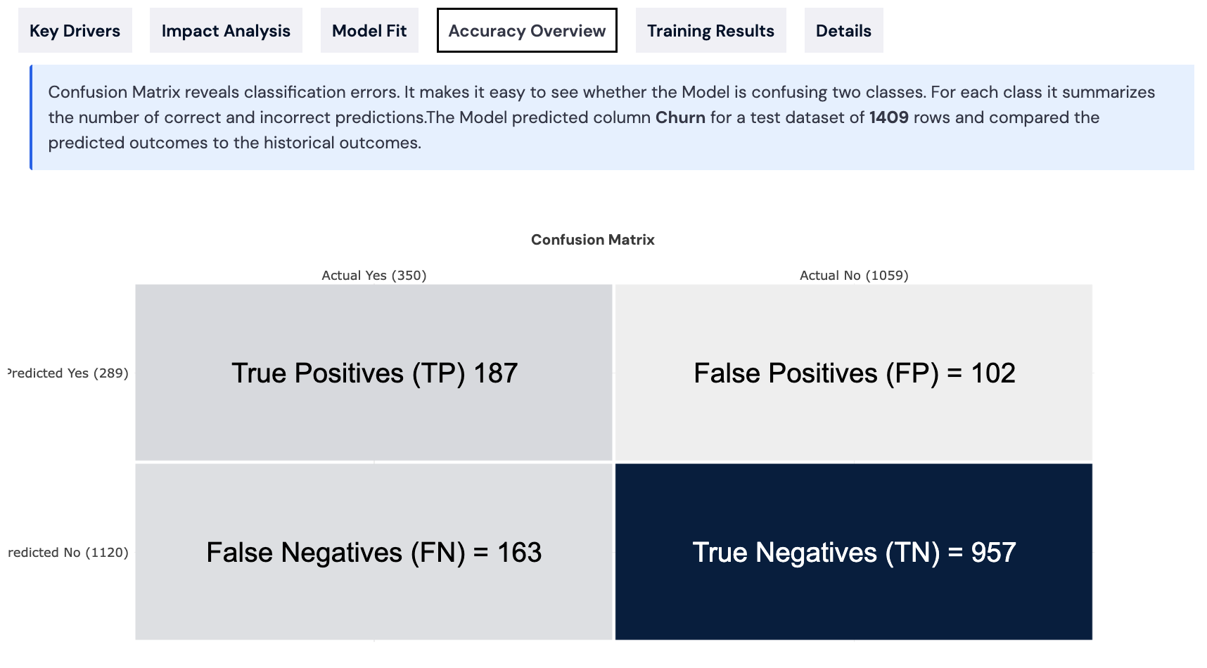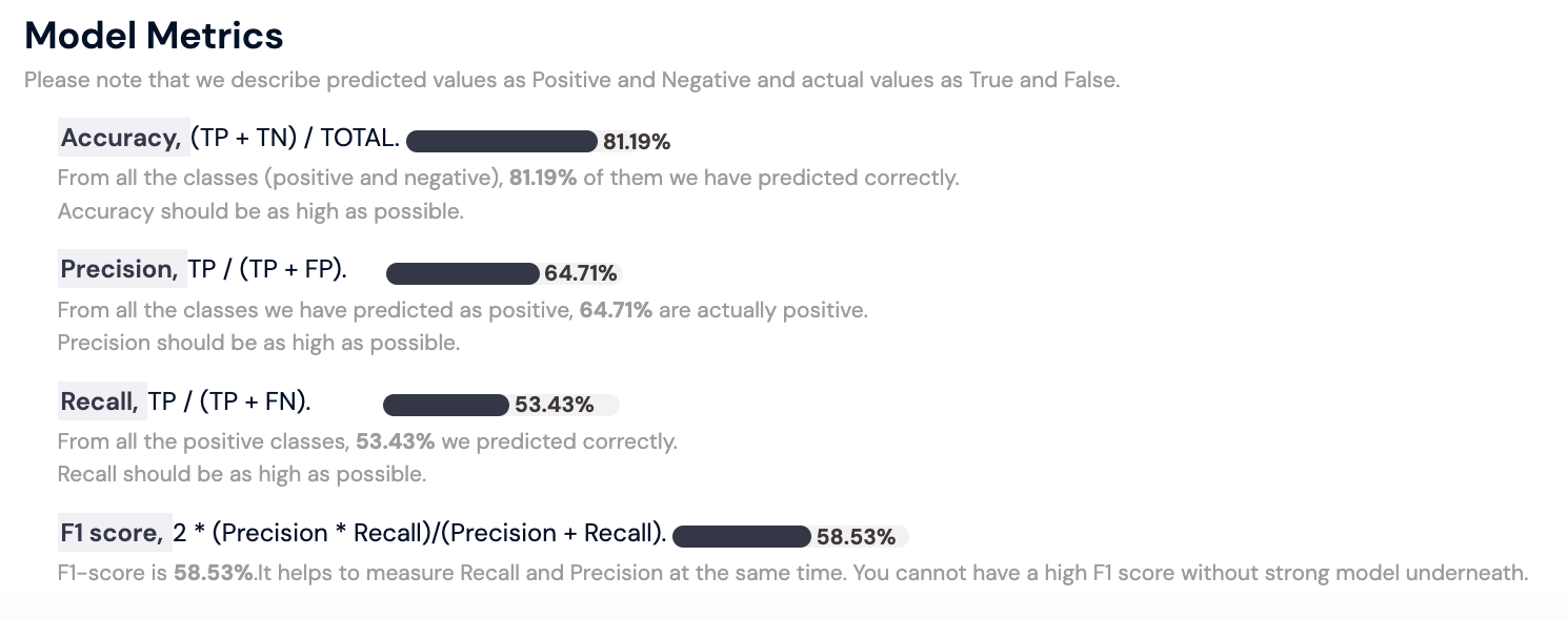 On the Accuracy Overview tab, you'll find detailed information on correct and incorrect predictions (True positives and negatives / False positives and negatives). Model metrics are explained at the bottom of the section.