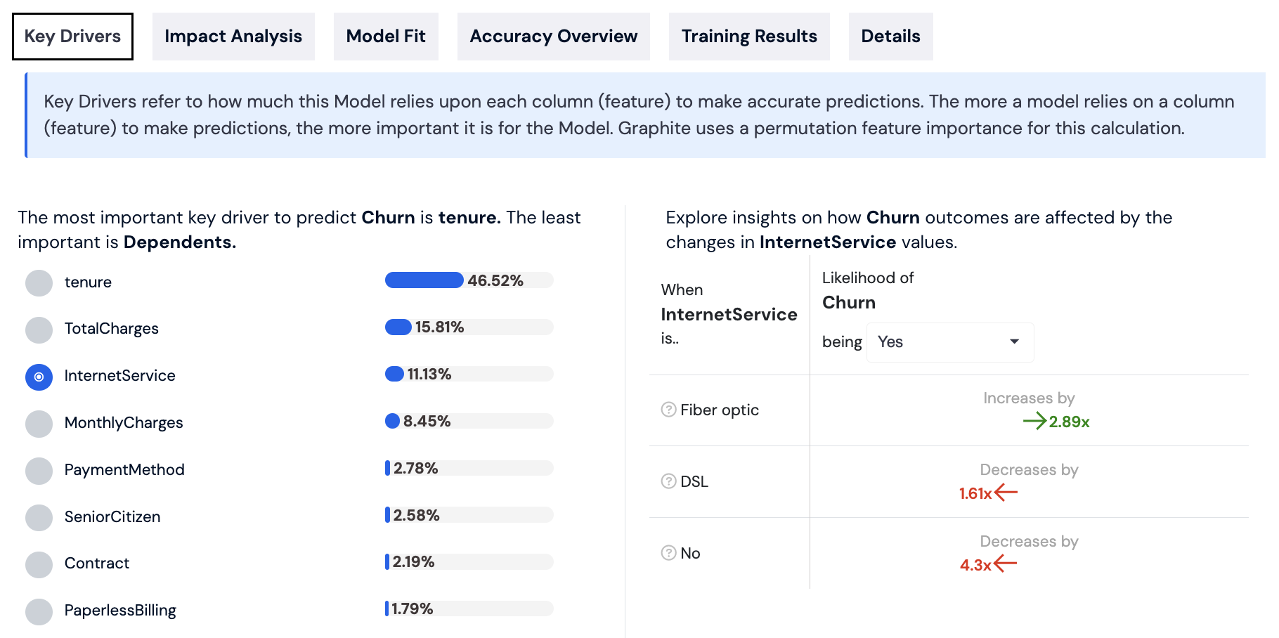 Key Drivers indicate the importance of each column (feature) for the Model's predictions. The higher the reliance of the model on a feature, the more critical it is. Graphite uses permutation feature importance to determine these values.