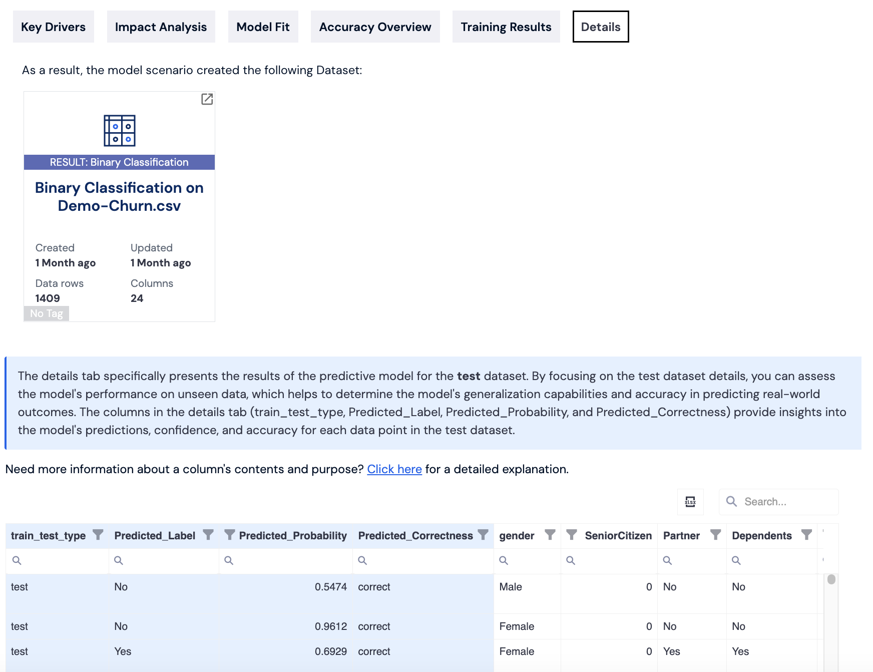 **Details tab** shows the results of the predictive model, presented in a table format. Each record includes the predicted label, predicted probability, and predicted correctness, offering insights into the model's predictions, confidence, and accuracy for each data point. Dataset test results can be exporetd into Excel by clicking on the XLSX button in the right corner.