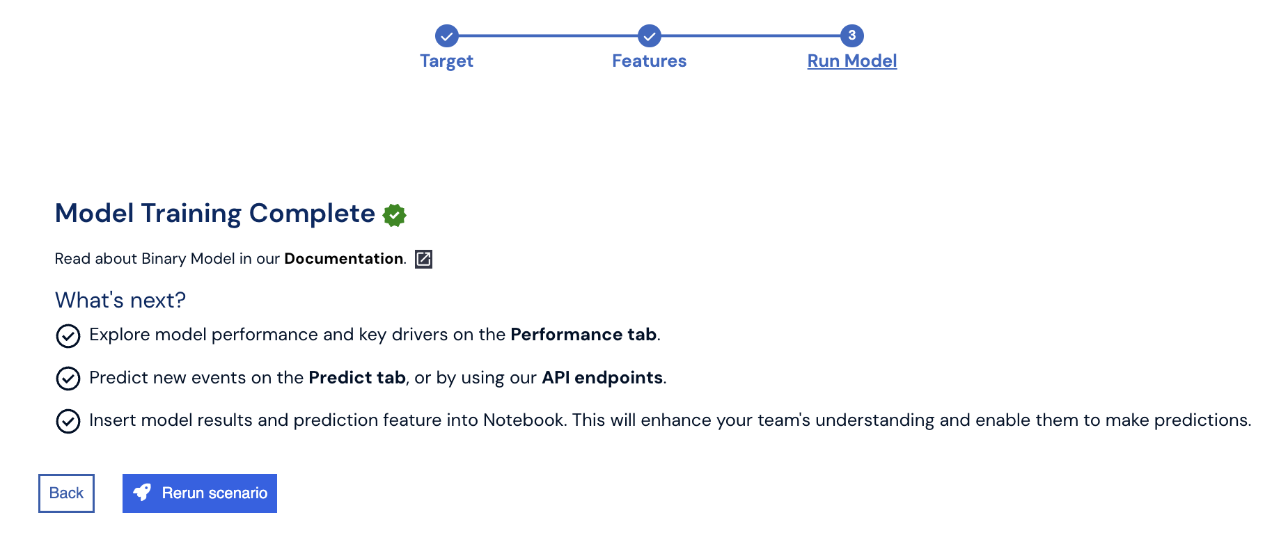 You can share your prediction results with your team using the Notebook feature. With Notebooks, users can also run their own predictions on your Binary Classification model.