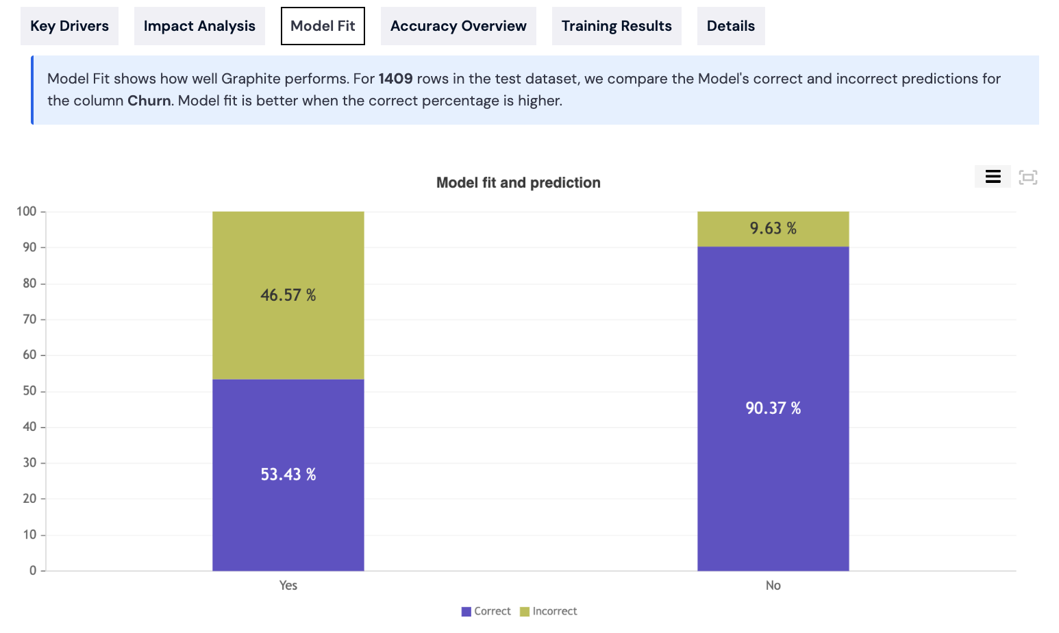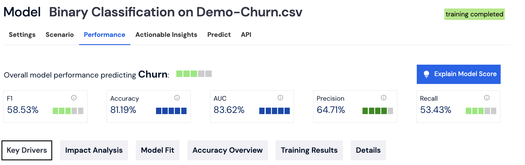 On the performance tab, you can explore six different views that provide insights related to model training and results: [Key Drivers](#key-drivers), [Impact Analysis](#impact-analysis), [Model Fit](#model-fit), [Accuracy Overview](#accuracy-overview), [Training Results](#training-results) and [Details](#details).
