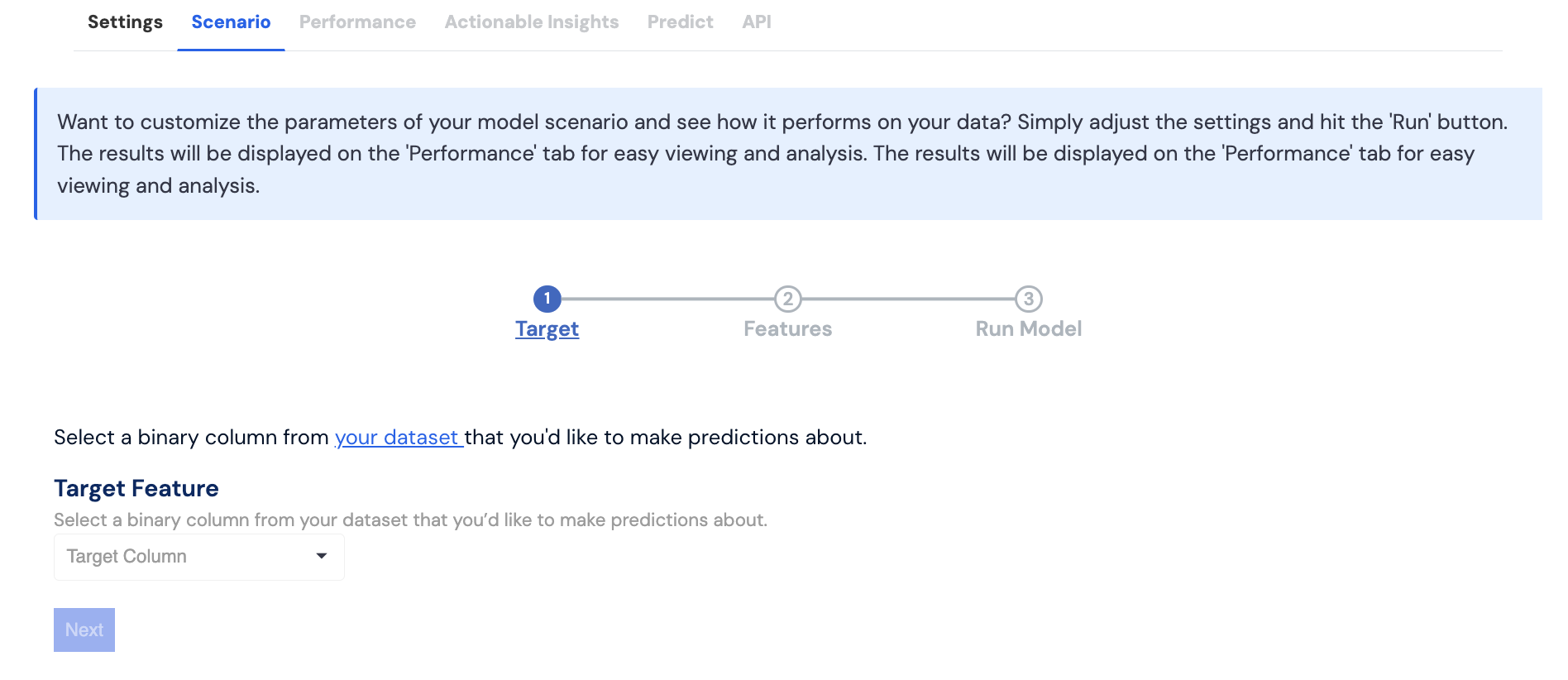To run the scenario, you need to have a **Target Feature**, which must be a binary column. This means it should contain only two distinct values, such as Yes/No or 1/0.