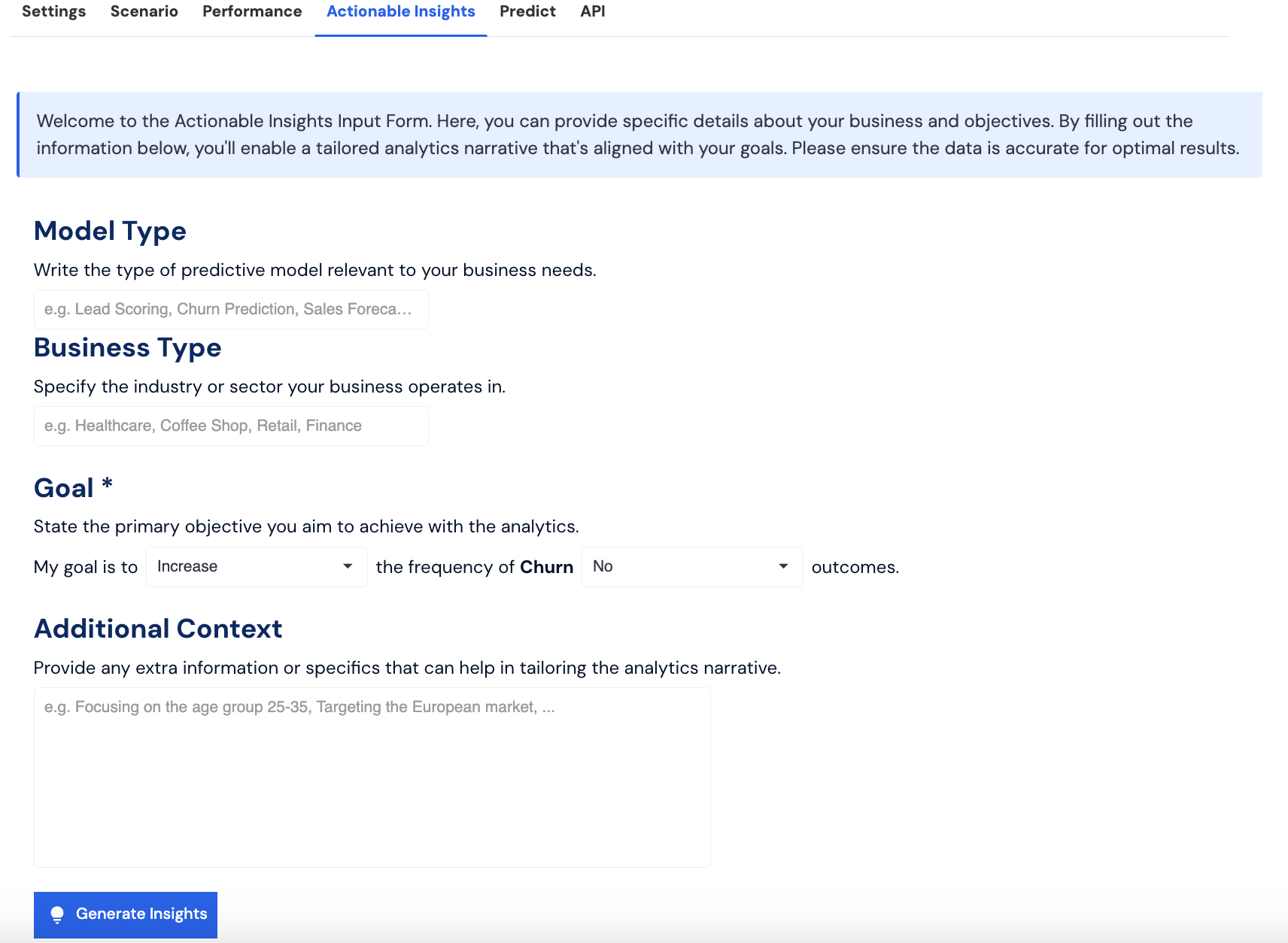 <figure><img src="https://3727300098-files.gitbook.io/~/files/v0/b/gitbook-x-prod.appspot.com/o/spaces%2FgnR78y9L7FDWeb4jdvdW%2Fuploads%2Fh5XWS87huF4GgIUDVLAz%2FScreenshot%202024-07-18%20at%2018.00.07.png?alt=media&#x26;token=313c4fb1-6ae9-4ce3-ad06-2f3fbe70bef1" alt=""><figcaption><p>Actionable Insights Input Form</p></figcaption></figure>