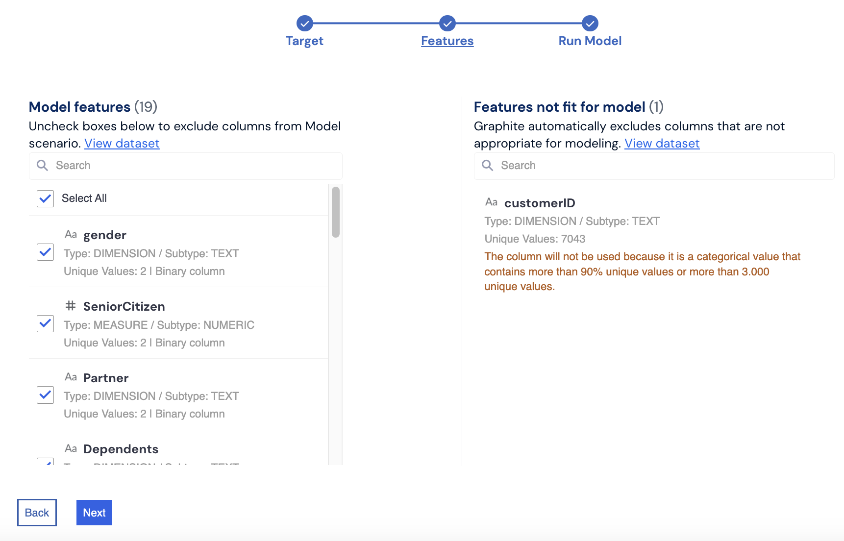 In the next step, select the **Model Features** you wish to analyze. All features that fit into the model are selected by default, but you may deselect any features you do not want to use. Graphite Note automatically preprocesses your data for model training, excluding features that are unsuitable. You can view the list of excluded features and the reasons for their exclusion on the right side of the screen.